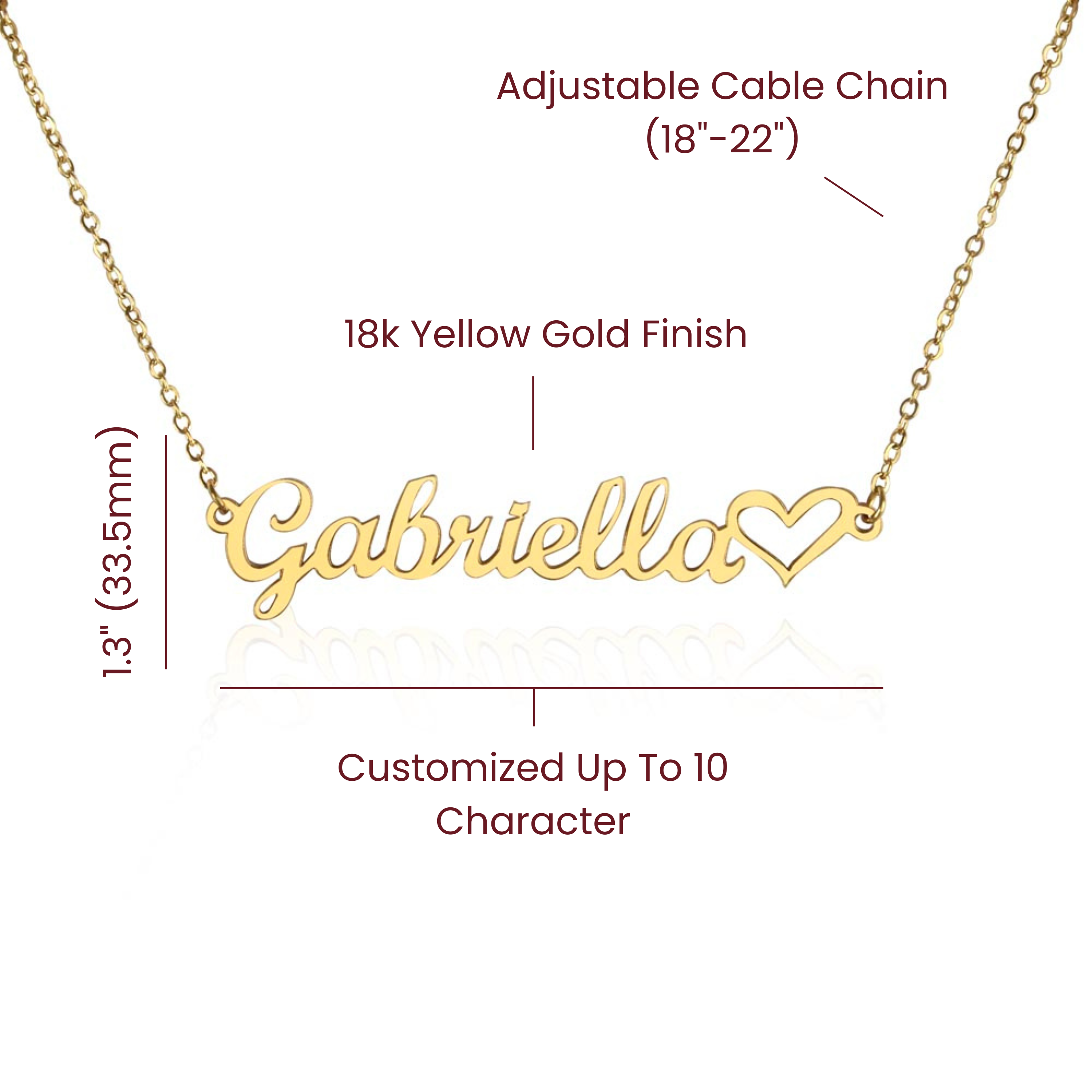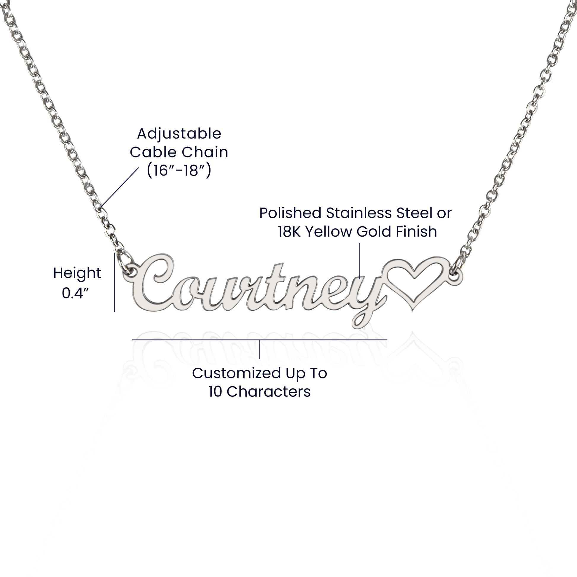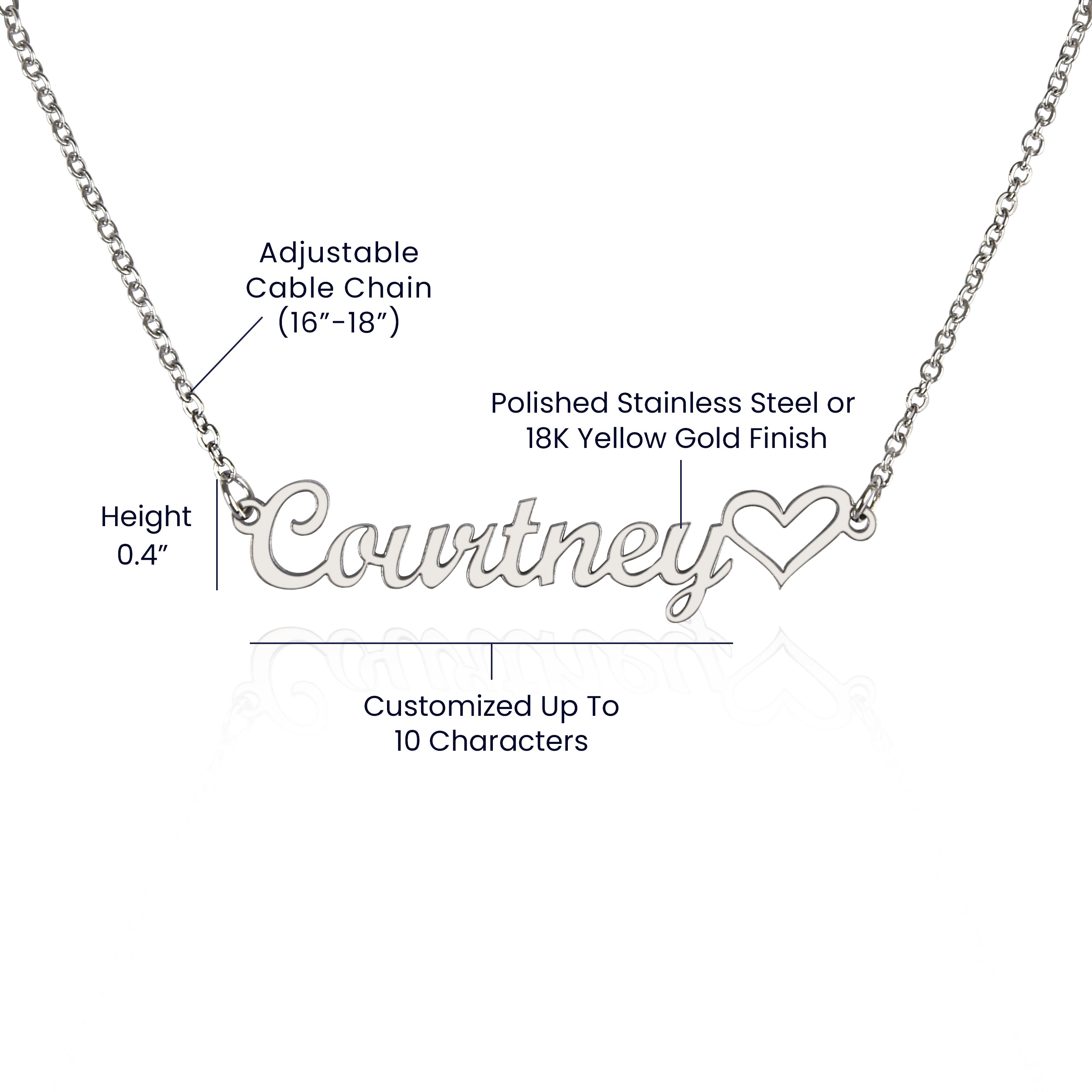 This stylish necklace features a cursive name design and heart symbol suspended on a 16”-18” adjustable cable chain, making it both personal and beautiful! Your necklace will be custom made upon ordering in the name or word of your choice, with up to 10 characters. It's a gift they will surely want to keep close to their heart forever!